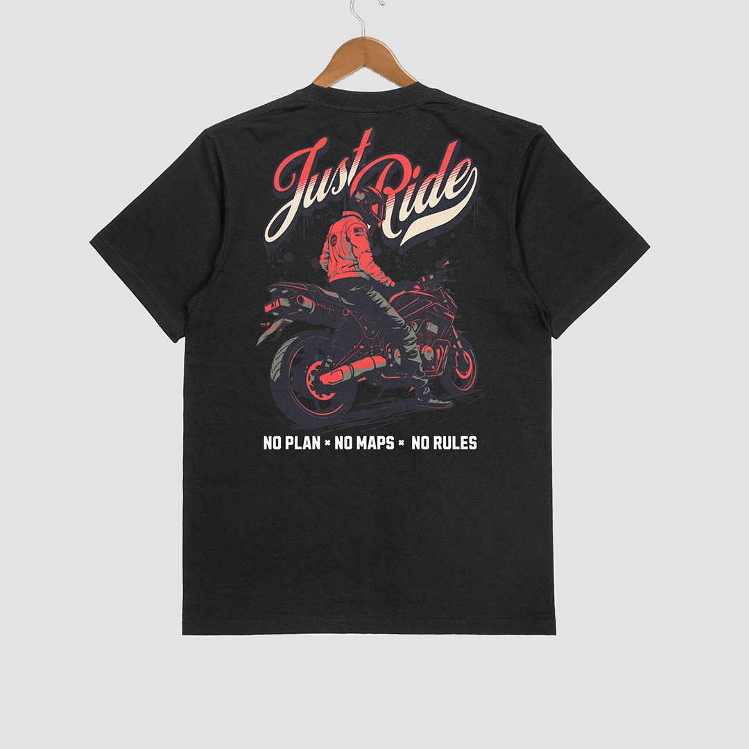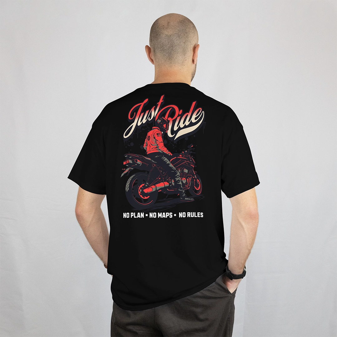 تيشيرت رجالي أسود بتصميم لسائق دراجة نارية مع عبارة “Just Ride”، مثالي للشباب اللي يحبوا الحرية والطلعات العفوية.