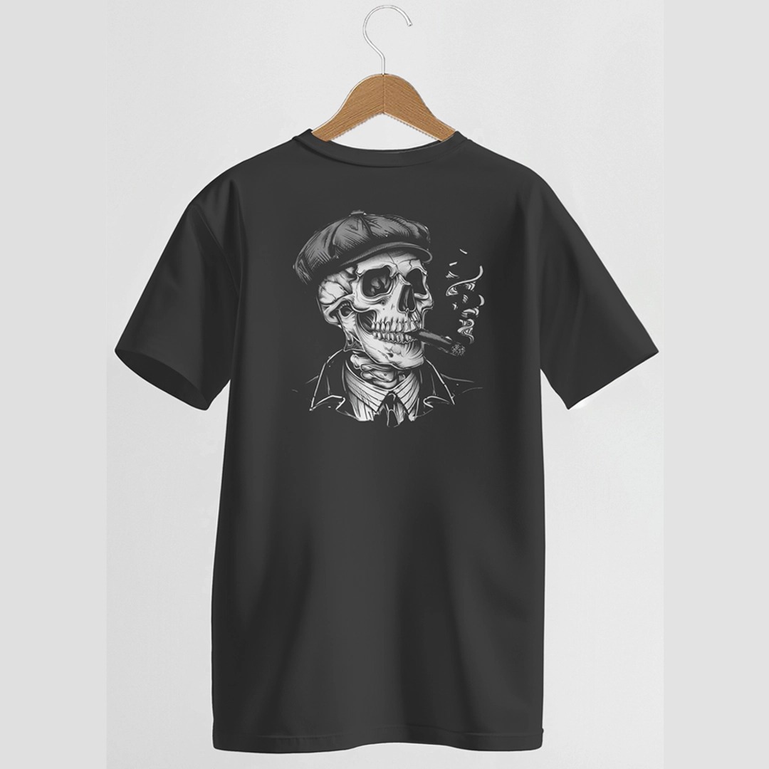 خلك قدّ التحدي بهذا التيشيرت الأسود اللي عليه تصميم جمجمة عصري يخطف الأنظار! من قدام رسمه بسيطة لجمجمة توحي بالقوة، ومن ورا تصميم فني لهيكل عظمي لابس بدلة وكاسكيت ويكعد يدخن، ستايل كلاسيك وبنفس الوقت عصري 🔥