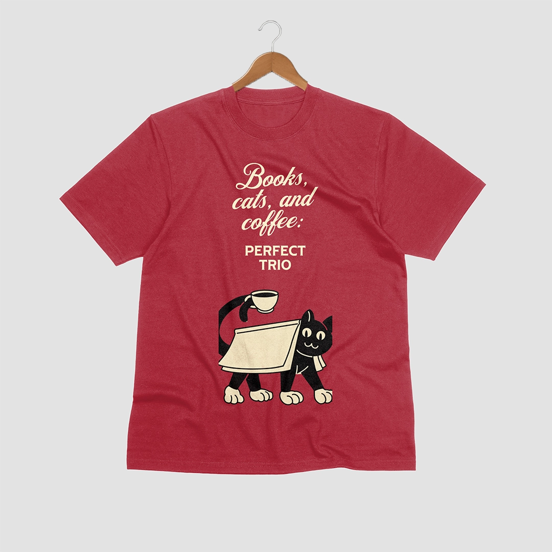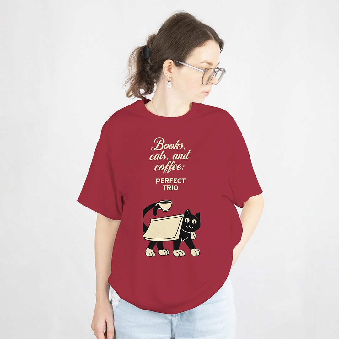 🐾 تيشيرت نسائي – كتب، قطط، وقهوة