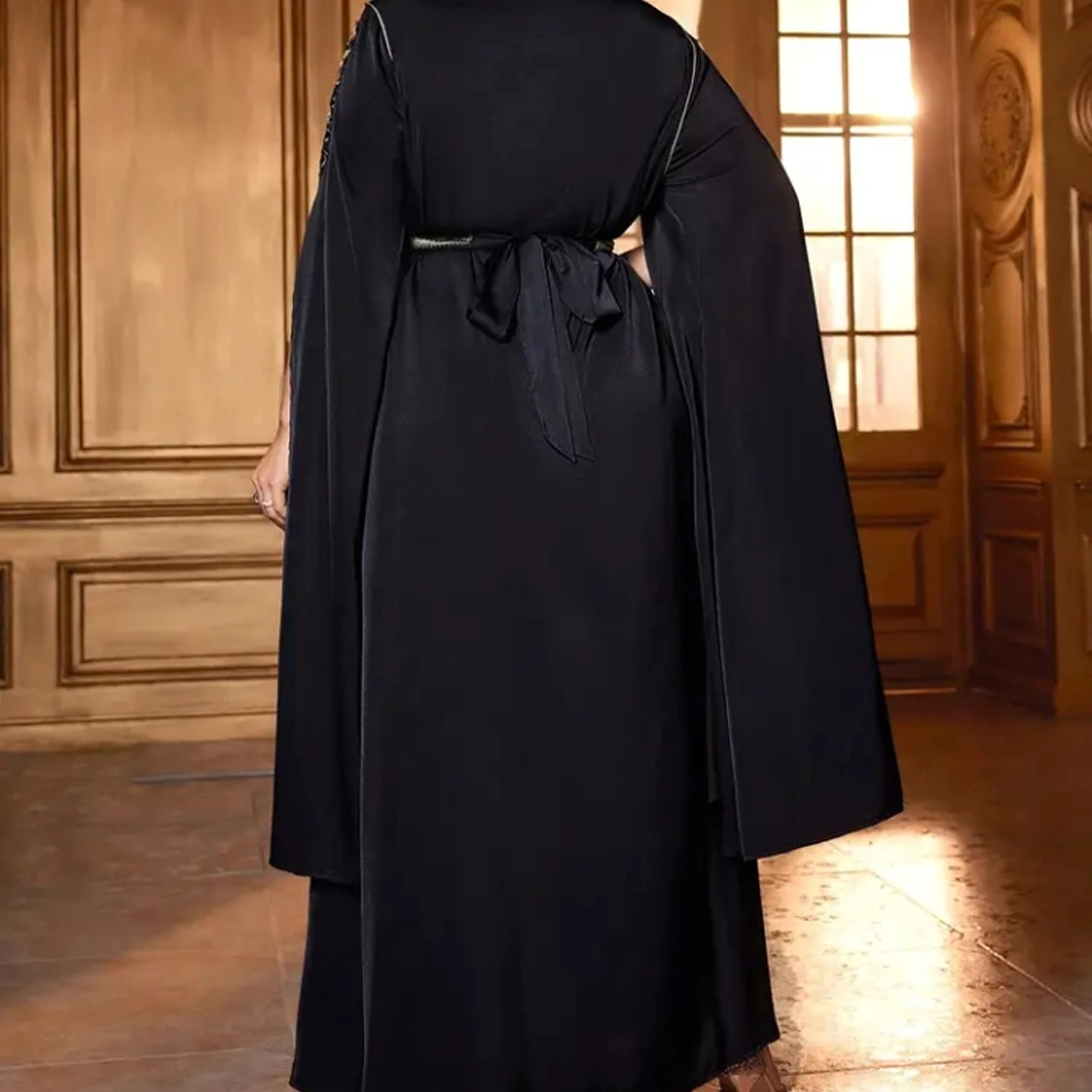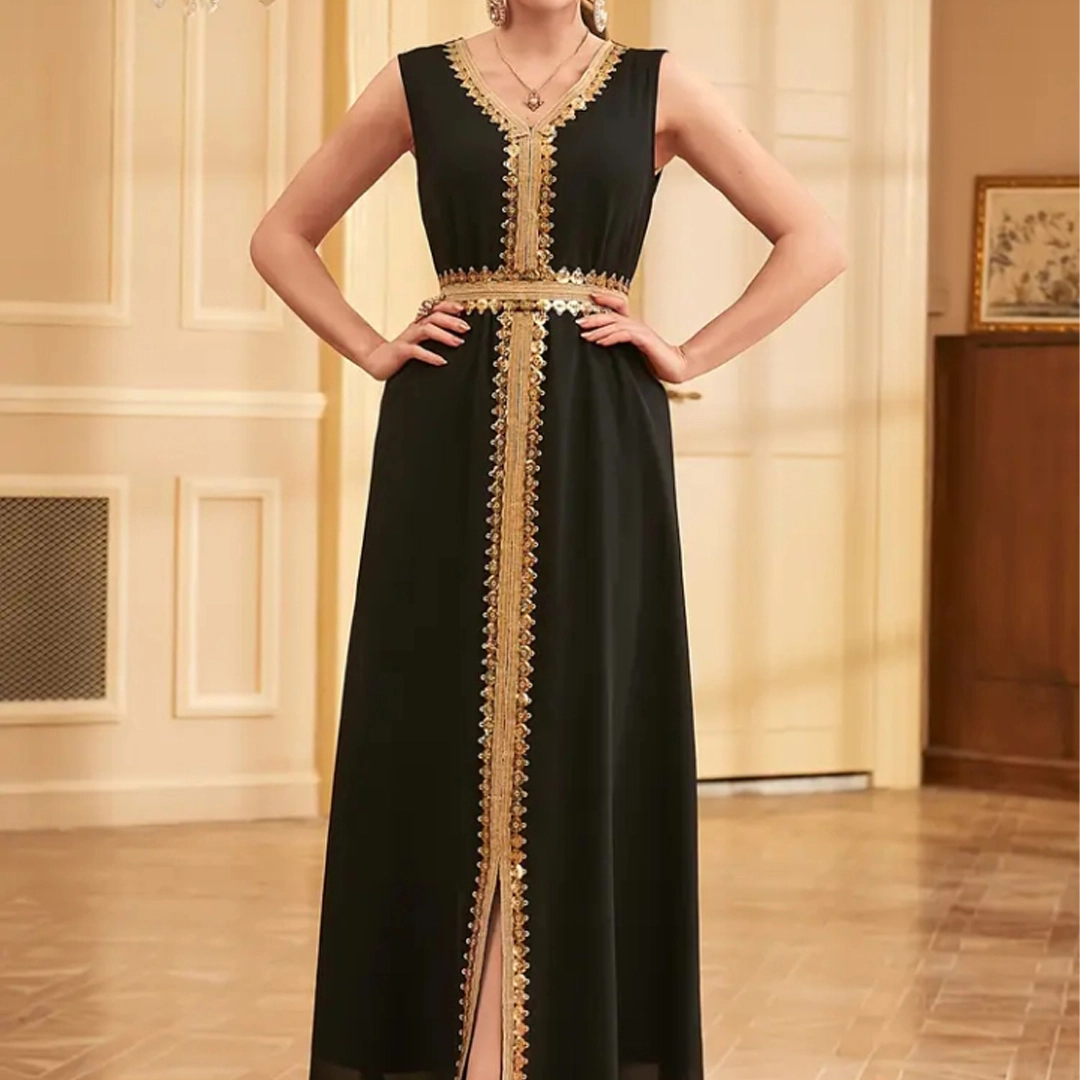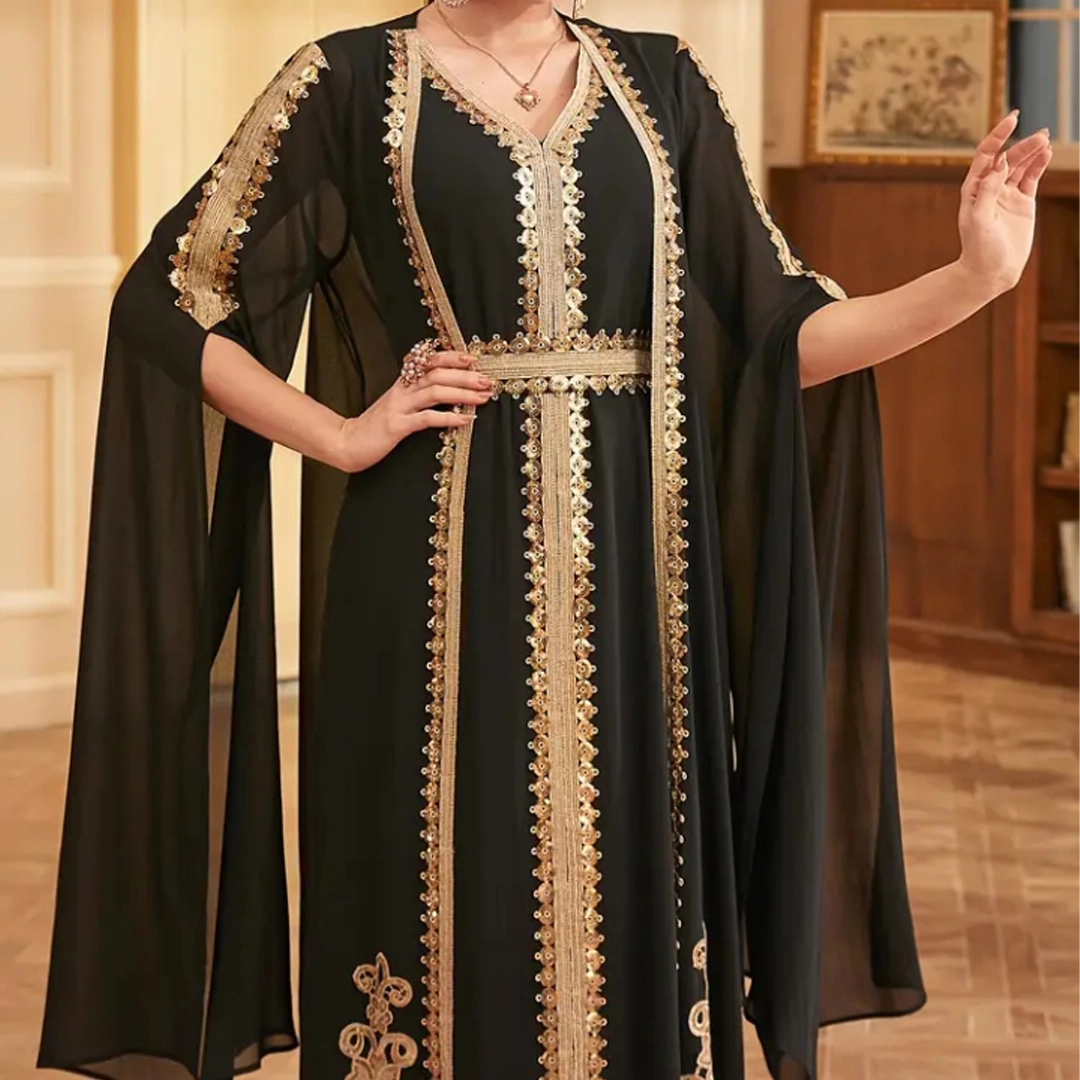 - حزام قابل للتعديل بنفس التطريز الذهبي لإبراز الخصر